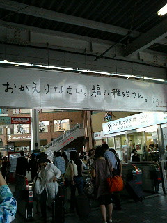 駅の改札の上にでっかく『おかえりなさい。福山雅治さん。』の文字が!