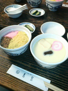 混ぜご飯に錦糸卵やそぼろを乗せて蒸した蒸し寿司と、おんなじサイズの茶碗蒸しのセット。